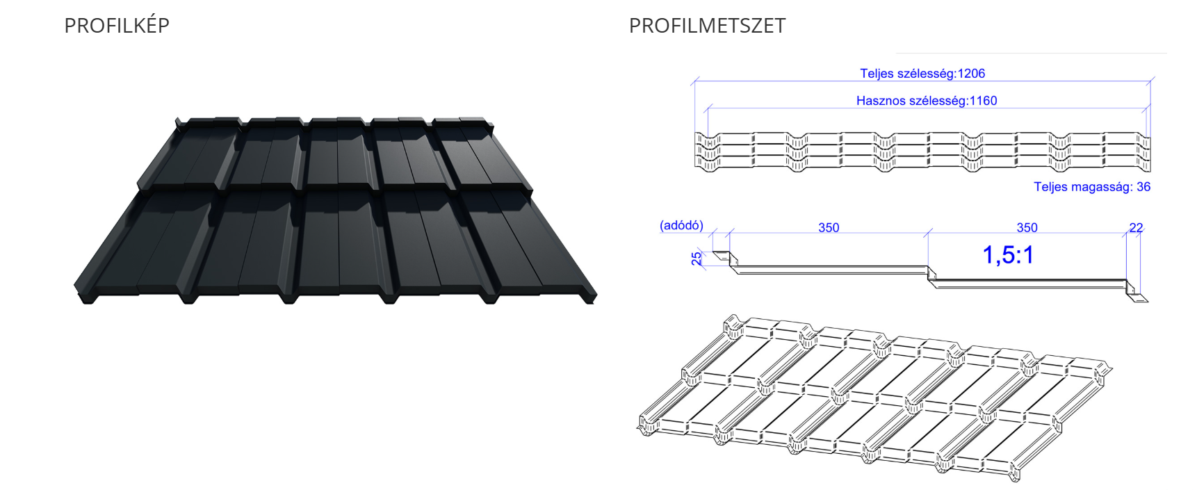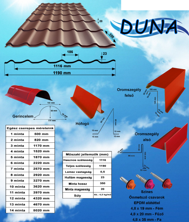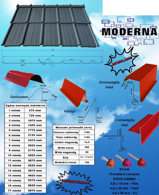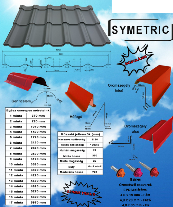 Az egyedi hosszban, szinusz formában préselt, 350mm-es cserépmodullal rendelkező tetőfedő lemez tökéletesen megfelel a mostani elvárásoknak, mind esztétikailag mind minőségileg. Sokszínűségével (többféle szín és bevonat választható), masszívságával (növelt bordamagasság), könnyedségével (max. 5kg/m2) és hullámzó tengert idéző megjelenésével szebbé és tartóssá varázsolja a tetőt.