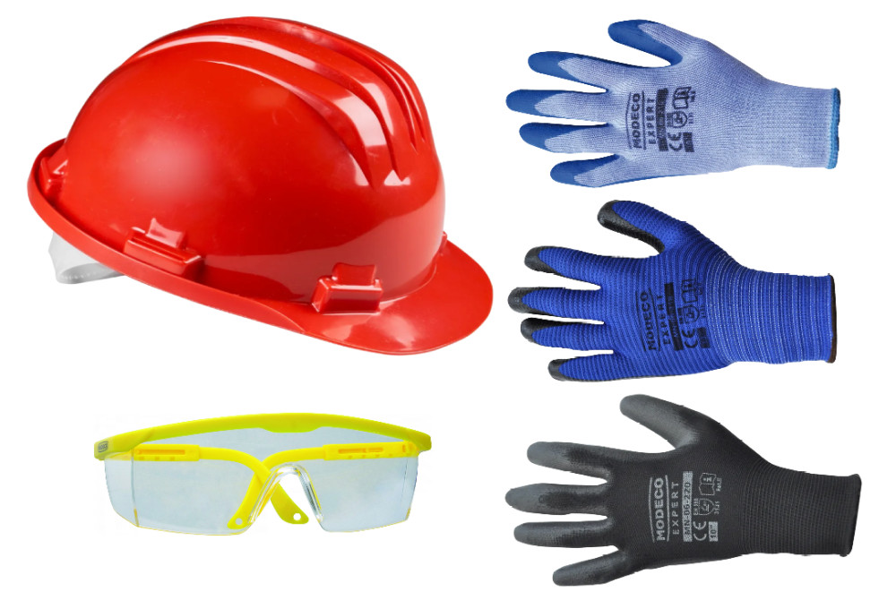 Védőszemüveg fehér CE minősítéssel, PU mártott szerelőkesztyű fekete (PN8003) 10, Latex mártott kesztyű piros 10, Latex téli kesztyű, kék bevonattal (méret:10)